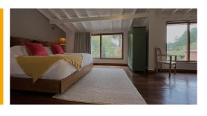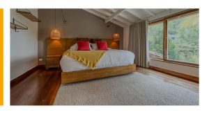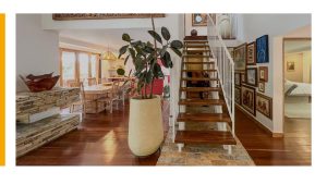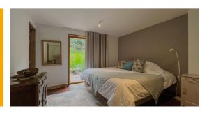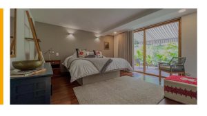 The main level includes 3 bedrooms (each with en-suite bathroom), a service room, and a spacious living-dining area with a fireplace that opens onto the deck with beautiful views. The open kitchen connects to a second dining space. Upstairs, the home offers a large master suite with scenic views and an additional bedroom with bathroom.